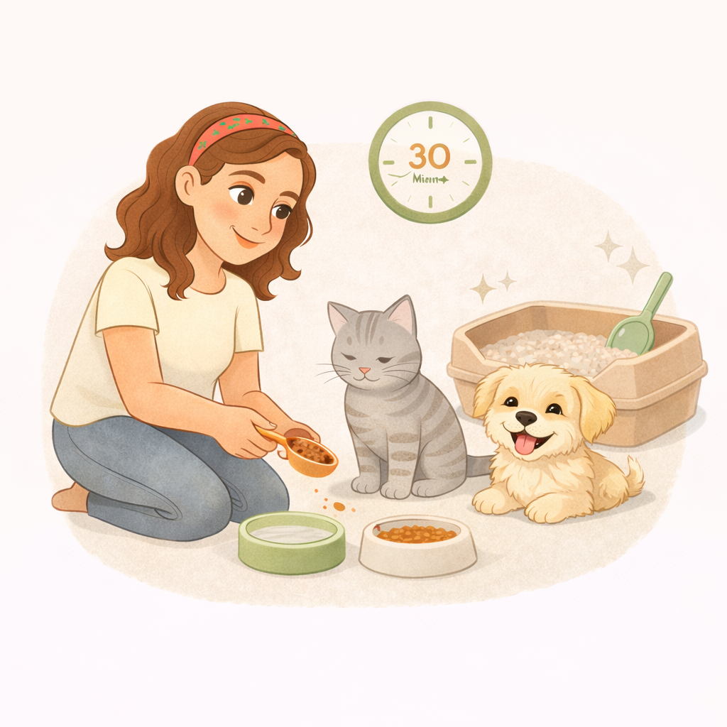 Je respecte la routine : repas, eau, litière/promenades, jeux, surveillance, et moments calmes selon le caractère de votre animal.