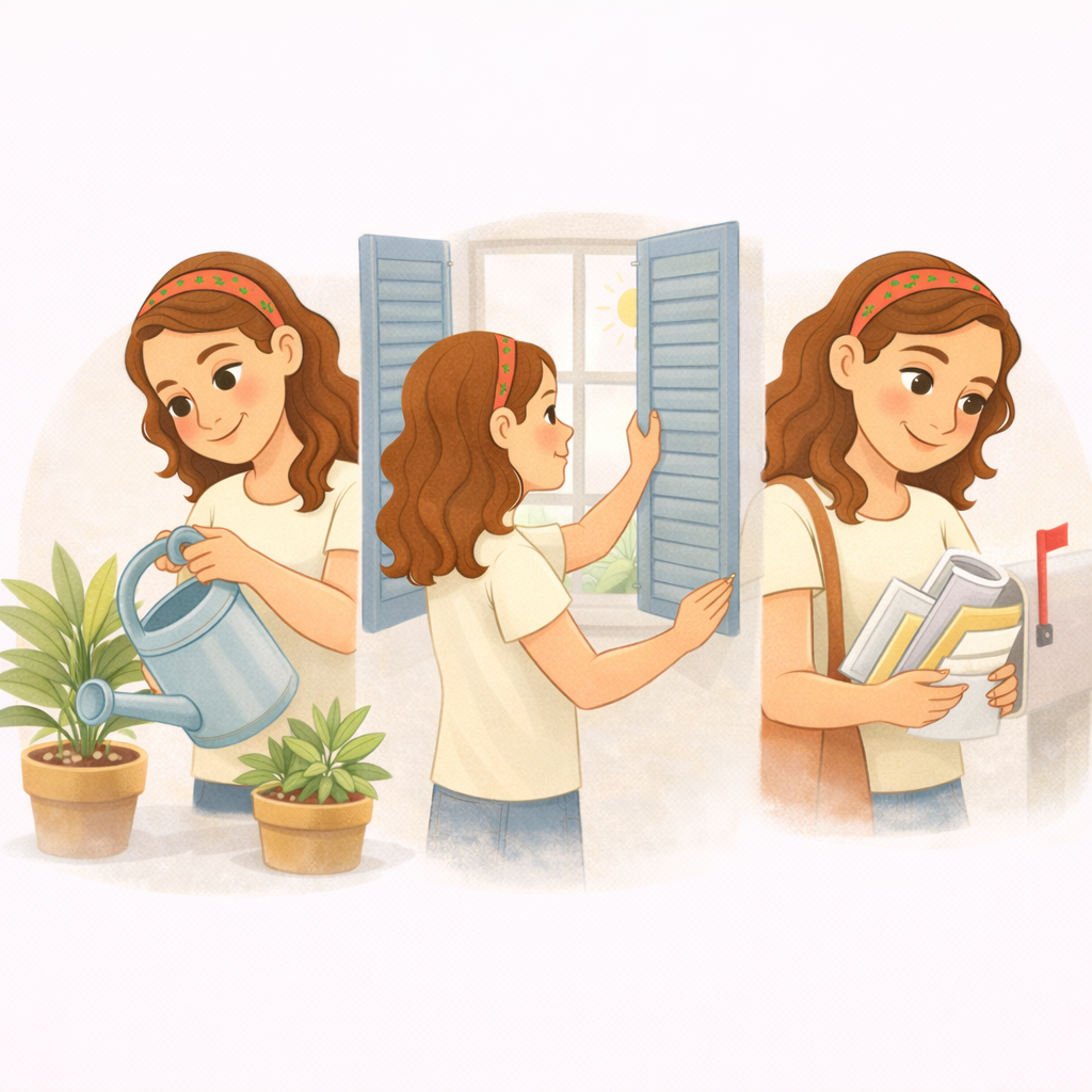 Arrosage léger des plantes, ouverture/fermeture des volets, relevé du courrier.